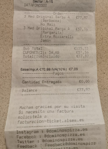 Read moreLe doy una estrella por qué hay que dar alguna para poder comentar,por qué si no,no le daba ni una sola.hace poco mi hijo a estado en San Fernando de viaje de fin de curso con su clase y un día fueron a cenar a este dominos en concreto...al terminar les habian sobrado varias pizzas que,por supuesto,habían pagado y les pertenecían.dijeron de llevárselas y los que les atendieron les dijeron que no,que eran para los pobres,lástima no haber dado conmigo,les abría puesto a escuadra por tal despropósito,las pizzas son de quien las ha pagado y hace con ellas lo que le viene en gana,repito,lástima no haber sido yo,se hubieran quedado calentitos,...panda de....mejor me callo...,al final mi hijo y sus amigos se fueron sin esas pizzas que sobraron y yo con la rabia de no poder pillar por banda a estos...pd:mejor no ir a sitios así,yo aviso y el que avisa...,lamentable y vergonzoso que una cadena como Domino's pizza se permita tener a gente de esa calaña...