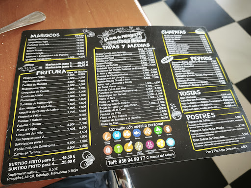 Read moreLa camarera más amargada imposible la pobre, a la mesa de al lado contestando mal, a nosotros el trato regular el domingo por la noche, las raciones regular, 6,50€ ración de croquetas de 3cm de grande (pequeñas) y trae 6 croquetas con más patatas que croquetas, se le olvidó el pincho de pollo, solo la mesa de nosotros, traigo la factura y no sabía ni cuánto era, para cobrar. Podría poner un poco más de simpatía, no se pide mucho tampoco, el trato no fue el más adecuado, si pido huevas y ahí con mayonesa o aliñadas, si digo una de huevas almenos que la camarera se interese en preguntar cuál de las dos, que al final trajo con mayonesa y la quería aliñadas, le dije que era aliñadas y se molestó. No se mala esperiencia en el trato. No creo que vuelva a ir más, ahí mejores bares por mis precio y mejor trato tanto en San Fernando, Cádiz, Chiclana, después que no se diga que "está la cosa mala" que la gente no gasta dinero en ir a cenar, éramos solo en el bar 7 persona en una mesa, no había más clientes, que menos un poco de simpatía y amabilidad y cuidar a sus clientes a que vuelva, no ofreció ni postre o café a los...