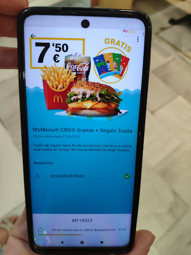 Read moreHoy día 27-06-2023 fui al McDonald's tras ver la oferta que aparece en la app y la cual comparto por foto. Al activar el cupón e intentar agregarlo al pedido a través de la máquina, aparece un error de que dicha oferta no está disponible. Al preguntar en el mostrador nos informa que la oferta no les aparece a ellos, que aparecen y desaparecen, por lo que debe de tratarse de un fallo.