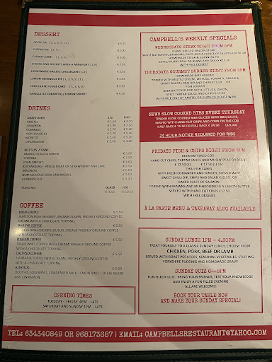 Used Campbell's for the first time and was taken there by friends. Have to say I was extremely satisfied with the service, all the staff were friendly that we had. The special was steak so the rest had the steak pie but I went for the sirloin. It was a very big cut of steak, cooked just how I asked for it and they also do.a.blue cheese sauce which some restaurants don't always do. I did also try the steak pie and it was very tasty and the meat was also very tender. Dessert was included as this was in with the special. We had Bailey's cheesecake which again was a very nice size portion and a good flavour. Probably would of preferred a strawberry but that's just my favourite. A good selection of desserts ice cream, death by chocolate and chocolate Brownie and I think a couple more but need to check the menu online. We didn't book but we were early-ish for Spain so we got a table no problem, you can also sit outside in their terrace at the side but we used the main restaurant on this occasion. Would definitely recommend it as the food is great and for four people using the specials was under €65 no alcoholic drinks with this meal. Will be...