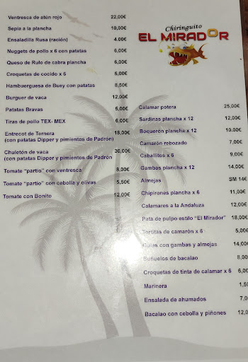 Read moreOutstanding restaurant which is fast becoming our favourite. All the staff are friendly, kind and helpful and especially Miriam, who speaks very good English. The food is always cooked to perfection The menu is quite fish/seafood based and our favourites are calamares andaluz and the spicy bravas but we were delighted to learn that they will be introducing more vegetarian options next year. Now we look forward to bringing our veggie family too! Thanks El Mirador team for making dining in your restaurant a delightful experience 😊. The views are absolutely...