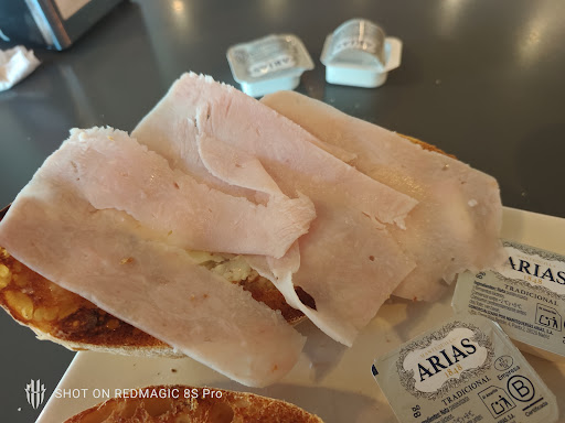 He pedido café con leche y una entera con mantequilla y pavo. Del café nada que comentar, Catunambú dentro de la media. Mi sorpresa ha sido cuando me han servido la entera por la calidad y cantidad del fiambre de pavo (además no es pechuga sino fiambre como indico), literalmente para una pieza de pan de buena dimensión venía 1 loncha y media mal cortada y alguna zona translúcida.