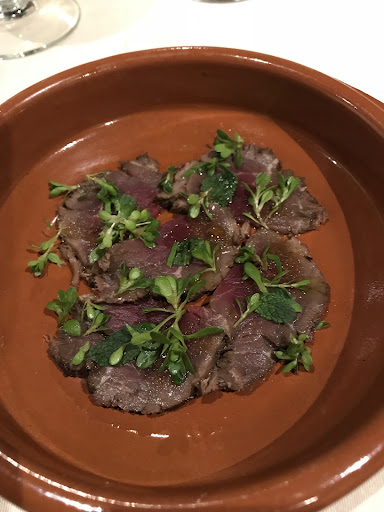 Aquí ofrece una propuesta de tapas y platos a la carta de temporada, muy asequibles, y un estupendo menú degustación que nos ha salido, con un semi-maridaje con 4 copas por cabeza, por 50 € euros persona: una relación amor-precio inmejorable. El menú va de menos a más: empieza con platos con protagonismo de pescado y vegetales muy correctos como el sashimi de salmonete con salsa ponzu con aroma de setas, pero cuando llegan las carnes es cuando flipas: platazos como tataki de ternera madurada del Guadarrama madurada, macerada y ahumada con hierbas aromáticas; conejo confitado con morcilla picante de León y base de sope de maíz mexicano; o paloma torcaz madurada con salsa de pollo a la cerveza, chipotle y zanahorias nos han dejado locos.
