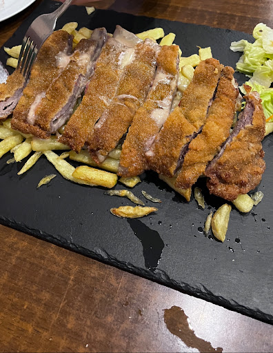 We are staying in the area and this place happened to be nearby. What a great find. The food was really reasonably priced, simple, and delicious. I ordered a half portion of Boquerones and they came beautifully presented with a little homemade tomato salsa. Wonderful. There must have been about 10 pieces and cost 6€ for the plate. The porkloins were well cooked with a delicate cheese sauce and homemade chips, we ordered two and shared them between 3 of us on the advice of waiter and did not go hungry. Finally, the cheese cake, simply divine, 100% one of the best I have ever eaten, ever anywhere. We enjoied everything we ate and even the coffee was fantastic. The best thing about it was the atmosphere, all the staff were kind, accommodating and attentive. To finish it off the place was super clean. We paid 50€ for the three of us with drinks. A must try if you are in the area and 100%...