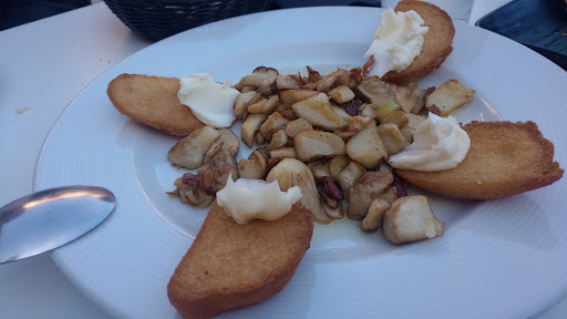 Huevos estrellados: El fallo más notable sin duda es que las patatas no estaban fritas, si no confitadas (cocidas en aceite). Lo que quiere decir que las patatas no estaban crujientes y habían absorbido en exceso aceite. Los huevos fritos lamentables, igualmente confitados, por lo tanto las yemas estaban completamente hechas. Sinceramente si un cocinero trae un plato así es que no quiere cocinar.