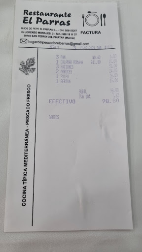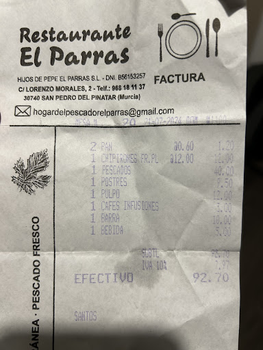 We had aperitivo of Bombay G&T plus a small beer and a tapa. Followed by 2 starters, which we shared; clams and octopus. Marvellous. Mains, 2 sea bass with 2 glasses of white wine and another beer. Two Desserts with coffee. Total €83. A bit pricey for this area but its top quality fish so you pay a small premium.