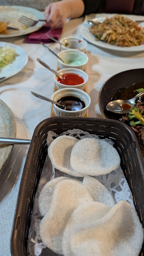 Los platos que pedimos fueron bastante variados y en general estaban bien preparados: • Pan de gamba: Este entrante, cortesía de la casa, acompañado de varias salsa estaba muy rico. • Rollitos de primavera 🥢: La masa era crujiente y el relleno de col y zanahoria estaba jugoso, aunque le faltaba un poco más de condimento para resaltar los sabores. Acompañados con la clásica salsa agridulce, cumplieron, pero no destacaron demasiado. • Pollo con Almendras y verduras 🍗🥕: Buen equilibrio entre los ingredientes y una salsa con el espesor adecuado. Los champiñones, el calabacín y la zanahoria estaban en su punto, aunque el pollo podría haber sido un poco más tierno. • Ternera con brócoli 🥩🥦: Uno de los platos más recomendables de la cena. La carne estaba bien cocida y la salsa tenía un sabor intenso pero equilibrado. El brócoli aportaba frescura y textura crujiente, combinando bien con la ternera. • Fideos asiáticos 🍜: Un plato generoso en porción, con verduras, huevo y pequeños trozos de jamón. El sabor y la textura estaban bien logrado.