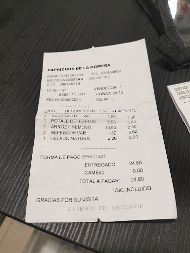 Zum Essen: Wir sind auf Empfehlung eines Reiseführers hierher gekommen. Das Restaurant wird angeblich von Gomeras 'Starkoch' Fabien Mora geführt. Kurzum:das Essen war eine einzige Enttäuschung! Ich hatte warmen Oktopussalat als Starter, den konnte man zwar essen, aber er war extrem fad, der Oktopus war geschmacklos, wässrig und verkocht. Schlimmer war dann das Hauptgericht. Ein 'Rinderfilet' an Almagrotesauce! Das Fleisch war so zäh und ledrig und von Fasern durchzogen, dass man es nicht essen könnte. Ich würde mit so einem Fleisch allenfalls einen Gulasch machen. Die 'Almagrotesosse' war etwas Almagrote mit Sahne verdünnt. Absolut ungenießbar! Ich habe mich dann beschwert und angemerkt dass das keinesfalls ein 'Filet' ist. Die Kellnefin hat das so aufgenommen und wollte sogleich ein 'Filet' bringen: "only 2 minutes"... Nach 2 Minuten kam sie dann mit demselben Stück Fleisch wieder. Es war einmal in der Mitte aufgeschnitten und nochmals gebraten. Absolut ungenießbar. Offensichtlich verstand sie darunter 'filetiert'. Ich habe dann leider 1/3 des Fleischs gegessen was zu erheblicher Magenverstimmung geführt hat!! Den Rest ließ ich zurückgehen mit der Anmerkung dass es nicht essbar seie. Berstanden hat die kellnerin wohl nichts davon richtig! Auch das Gemüse war lieblos in Wasser gekocht und fade. Nur das Kartoffelpüree war essbar. Die Rechnung enthielt trotzdem den vollen Preis für mein Gericht! Ich hatte noch den gesamten Abend und den nächsten Tag Magenprobleme. Ich warne alle ausdrücklich vor diesem Restaurant! Wir waren in vielen Restaurants auf La Gomera, aber das 'Caprichos' war mit Abstand das schlechteste und zudem dreckigste!...