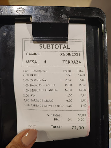 La 1ª sorpresa viene cuando, tras las bebidas, nos toman nota de la comida. No hay cartas en las mesas ni tampoco nos las ofrecen. Nos indican verbalmente qué hay de comida. Las sugerencias son apropiadas pero, que no sepamos el precio previamente, a día de hoy, es sintomático.