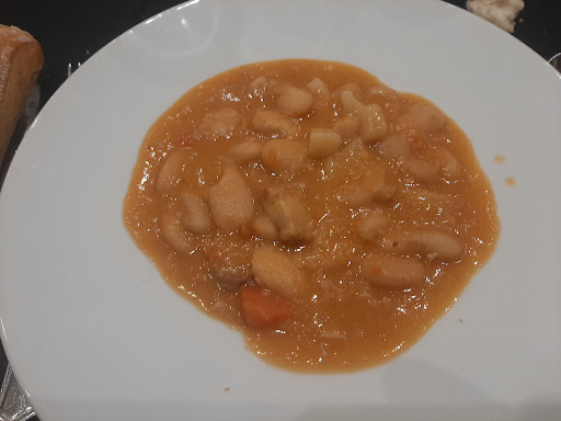 La comida no mucho mejor, muy normal. No hay carta sino solamente un menú de 25 euros, cuya relación calidad precio no es muy buena. Para mí se corresponde más con un menú del día de 10 euros. Primer plato: Judiones de la granja, sin más, llevaban algo de tocino y un trocito de chorizo, nulo sabor. Segundo plato: atún a la plancha. La rodaja era extremadamente fina, parecía de embutido cortada a máquina. El atún es un pescado seco de por sí, si se hace la rodaja tan tan tan fina, se queda aún más seco. A lo único que sabía era al aceite y perejil que llevaba por encima. El postre: tarta de queso que no sabía a queso.