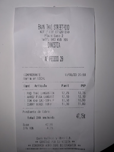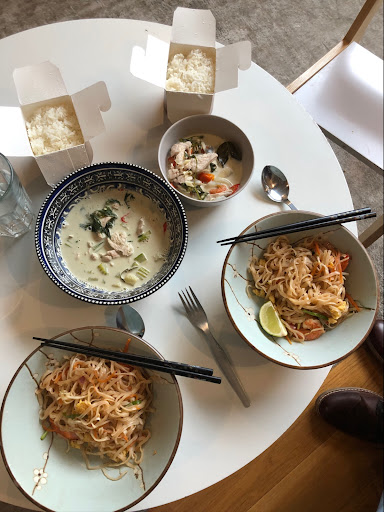 Read moreComida Tailandesa deliciosa! He estado 2 veces en Tailandia y puedo decir que la comida es IGUAL! Hasta el corte de las verduras, como la zanahoria en forma de estrella, es como volver a sentirse de vacaciones en Phuket. Lo que solemos pedir nosotros es: Phad Thai, Phad Mama, Curry verde y dos de arroz cocido para comer con el curry. En todas estas opciones puedes elegir entre pollo, cerdo o langostino. Los langostinos estan muy muy ricos! Hemos probado tambien los langostinos rebozadas y estan deliciosos! Los envases son todos de papel y cartón y se agradece mucho el detalle con el medio ambiente.