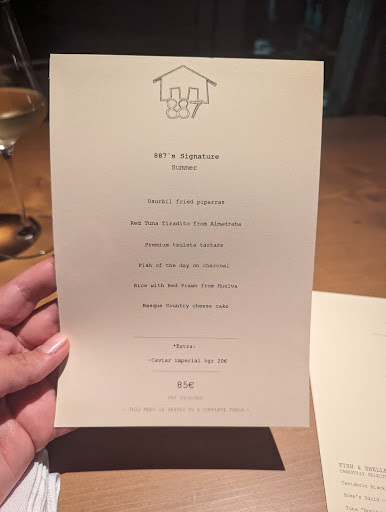 Starter: olives and artisan bread. I highlight this because I had never liked olives as much as this time around. The bread also was very tasty - everyone ordered 3 to 4 rounds of bread. 1st dish: sardine and tomato tostada, extremely fresh, soft, crunchy, savory; 2nd dish: croqueta de jamón ibérico with black truffle and a jamon gelatin. BEST CROQUETA EVER!! 3rd dish: nigiri trio - fat tuna, scallops and red prawns. simply amazing. a classic of the house. 4th dish: tiradito de atum. bluefin tune sashimi, a great way to extend the wonderful tuna nigiri taste. 5th dish: steak tartar. the best one I've had in my life, not kidding. 6th dish: guioza with two wonderful sauces. a mayonnaise with red aged misso and ponzu sauce. 7th dish: vegetarian station dish. guisante lagrima, artichokes and asparagus soup, amazing, original, unexpected and surprising. maybe the best dish in the whole night 8th dish: chuletón, fries and red peppers. amazing dish, medium rare, soft and good taste. fries very crunchy and soft, everything on point.