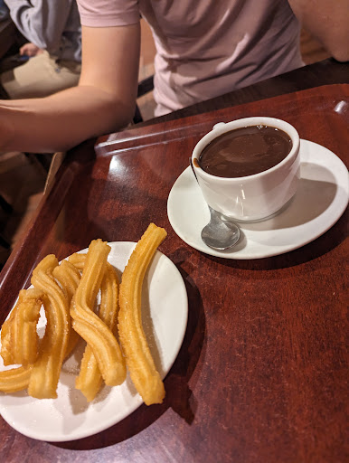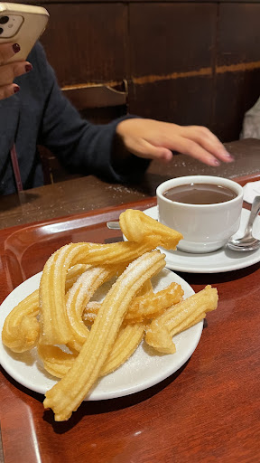 Read moreWe sheltered here from the rain which most people seemed to be doing as it was completely packed inside, full of locals and tourists alike. Managed to get a table and had the classic churros with chocolate dipping sauce - the churros were fresh and well fried though the sugar was unnecessary, typically it’s served without, and the chocolate was disappointing. It was not rich and chocolatey enough, too thin so did not coat and stay on the churro properly and overall needs improvement.