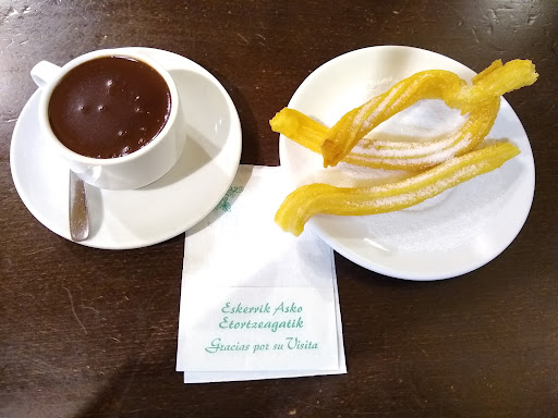 Read moreIgual q todas las mesas están pegadas unas a otras, me parecía un horror, pero cuando decidí entrar ya sabía a donde iba. Lo q no sabía era la decepción q me supuso, no voy a mentir, antes había otra churrería y siempre iba a aquella, pero ahora q no está, no había venido aquí hasta carnaval, y la verdad esq mi concepto había cambiado un poco, ademas pusieron a una chica para agilizar el servicio y te ivan sentando ellas, mientras hacías fila y oye, ni tan mal. Pues el chocolate sin más y los churros calientes, recién hechos, que es lo q le pides a una churrería. Entonces, este fin de semana q había vuelto el invierno a Donosti… repetimos! Y… Error!!!! No había nadie, cosa q ya nos podía hacer sospechar en la barra 3 camareras, hablando de sus cosas, tú te pones en la barra y esperas a q alguna se le ocurra mirarte, pides dos chocolates y docena y media de churros, y te dicen q tienes q esperar, (qué bien!!! Xq así nos comemos los churros calientes como en carnavales) uno de los chocolates era para una niña, así q le pedí q un chocolate me lo sacase antes, para q se fuera enfriando, pues… Los 3 me los sacaron fríos y no se como se hace eso, cuando tienen una chocolatera. Y al final no esperamos, xq la rubia q estaba en el puesto de los churros, le pareció una buena idea plantarme los viejos, lo q no se si tirados a recalentar en el aceite o no, desde luego incomibles, imagino q volveré, xq no tienen competencia, pero no descarto pedir un glovo a cualquier churrería ambulante y hacer yo el...