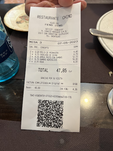 Read moreNosotros vamos al restaurante a por la comida porque vivimos cerca y no tardan nada ,lo que te fumas un cigarrito. Siempre pedimos lo mismo y muy bien ,calentito ,rico y con fundamento . Rollito primavera 1 Arroz 3delicias 1 Gambas y setas chinas con bambú 1 Y un pan chino. Y la salsa agridulce que va con el rollo . Esto para dos personas ,somos de comer poco comparado con otros que les parecen raciones pequeñas. Y lo pedimos para llevar ,no llamamos ,se tarda menos si vas a pedirlo. Y nos parece buenas raciones. Para una persona es mucho. Un táper es para uno? No se... Total 18,48€ el postre lo...
