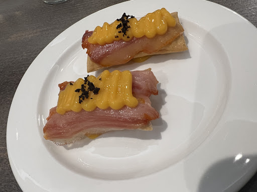 Empezamos con un chicharro ahumado delicioso , con salsa de yoghurt e hinojo . Espectacular el sabor ahumado del chicharro