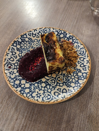 Y de postre una tarta de queso al horno espectacular con la base deshecha en forma de tierra , muy buena de sabor y con interior consistente pero jugoso