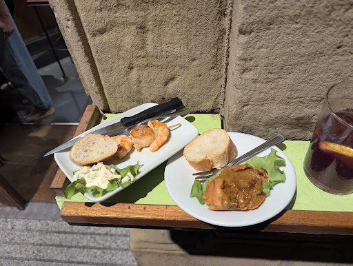We arrived at 13:30 to this tiny 400 square foot tapas bar. There are three tables inside and about 10 bar stools but most folks are just whipping in and having a beer. My partner was not in the mood to deal with ordering so I bellied up to the bar. Our total order cost 33.8€ and included 4 glasses of house red wine. What a screaming deal! We had a scallop and prawn brochette, the brick of bacalao, prawn & langostino fritters, meatballs with potatoes, a bit of duck loin served on a garlic toast, and scallops gratin. It was all a taste sensation!