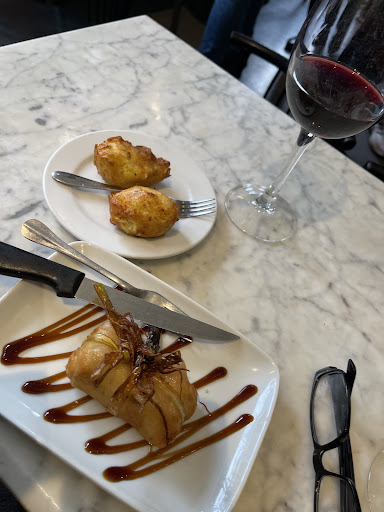 My partner wanted to order two bricks of bacalao but I said no. I was wrong! This was a bit of salted cod wrapped like a present in phyllo type dough. The ribbon was green onions. It was baked and came out crispy but so creamy.