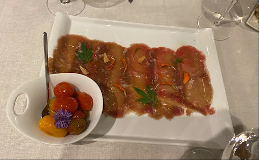 For a starter we had one of the specials - a carpaccio with cherry tomatoes - this dish was tasty but not overwhelming. For mains we had the meat. I had the duck which was tough - though still tasty because the peaches, cranberries and sweet potato cream that accompanied were very well made. My partner had the roasted lamb with the pear chutney which was flawless - sumptuously tender and delicious. For dessert we had the white chocolate egg which was unique and had rich flavors. To pair with the food we had the Izadi wine which was recommended by the waiter and was right on point.