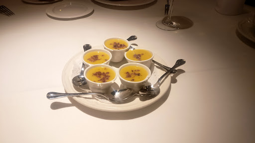 Then the 'seasonal' menu arrived. Tinned asparagus (?) under a crab bake, with so little crab that it was hard to discern. The other entree was a langoustine/salmon dish where the seafood was grey and dead on arrival. The green salad was umm... only just ok.