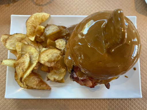 Hemos acudido a este establecimiento en familia. 4 comensales. Para beber 1 botella de sagardo (Sidra) 2 Mostos y una jarra de Agua. Para picar unas patatas con queso, bacón y salsa tipo mayonesa que estaban muy ricas. Queríamos también unas croquetas de jamón que aparecían en carta pero no tenían. Luego hemos pedido 3 hamburguesas.