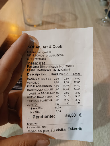 Bar con una atención muy eficiente! Fuimos para picar algo entre semana a mediodía, tenía buena asistencia de público y personal justo, pero muy eficiente, dando un servicio muy fluido y más que correcto. Tiene una carta de raciones, pintxos, plato del día, bocadillos y algo más, suficiente para lo que necesitábamos. Su oferta de bebidas es muy buena, vermuts, cervezas, vinos con buena selección (extranjeros también)... A lo que pedimos, una gilda con queso y un toque picante muy sabrosa y buena combinación, unos torreznos, los tienen en pintxo o ración, la verdad que de sabor estaban bien, pero aquí fallaron en la cocción, no estaban del todo crujiente, pero bueno, un par de minutos más al fuego y solucionado, unas croquetitas de chipirón, muy cremosas, bien cocinadas y con buen sabor a chipirón, aunque eché en falta algún trocito más de chipirón, pero bien hechas y sabor 10. Su ración de calamares fue de lo mejor, era lo que estábamos buscando, estuvimos en dos bares antes y preguntamos, ¿Son rabas o calamares? Uno no supo que decir y otro dijo rabas, (entonces ¿Por qué pone calamares en tu carta?) en el Kobak nos dijeron que eran calamares y lo eran, mejor aún, eran chipirones cortados a cuchillo y un rebozado fino, crujiente, sabroso y buena cantidad a un precio justo, valen la pena, ¿Por qué en otros sitios engañan dando pota por calamar? La gente ¿No sabe la diferencia? En fin, para terminar, una tortilla de bacalao individual y hecha al momento, no es común verlo en los bares, la tortilla era jugosa, sabrosa, esponjosa y al parecer hecha con huevos de "verdad", ya me entiendes, no? Pues eso, pasarse por este bar, vale mucho la pena, el camarero que nos tocó, hablaba al menos 4 o 5 idiomas y con un claridad perfecta! Si vuelvo a pasar por ahí, sin duda haré una parada en el Kobak Art & Cook de...