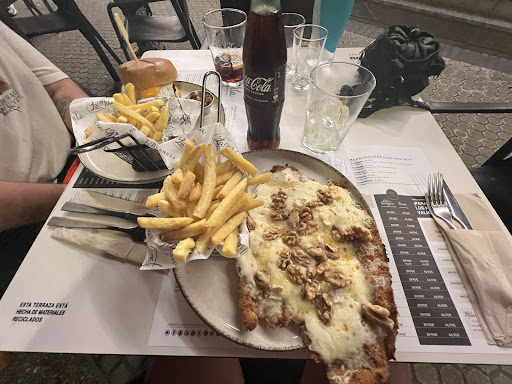 Ordered the La Mila Milanese, though it was right after my girlfriend ordered the La Mila salad, so pointed to it on the menu. The waitress asked, "Classico?" which my American brain translated as "standard," so I said sure, not realizing Classico was a different option. Didn't get what I wanted, but kind of my fault. Made due with some fries until I could order something else. Unfortunately, I jinxed myself yesterday by saying, "I haven't had a single bad fry the whole week we've been in Spain" the day before, so of course they were cold, soggy, and unseasoned other than salt. The waitress didn't pick up on the fact that 2/3 of my Milanese and half of my fries were uneaten, and as I hadn't had a bad dish anywhere, I wasn't about to make a deal out of it. So the nachos arrive. The chips were cold and chewy, and not only was the cheese on top of the dish entirely solid (apparently you're supposed to eat nachos with a knife and fork), the hamburger and sauce below was largely unflavored and, quite strangely for something served in cast iron, the bottom was completely cold.