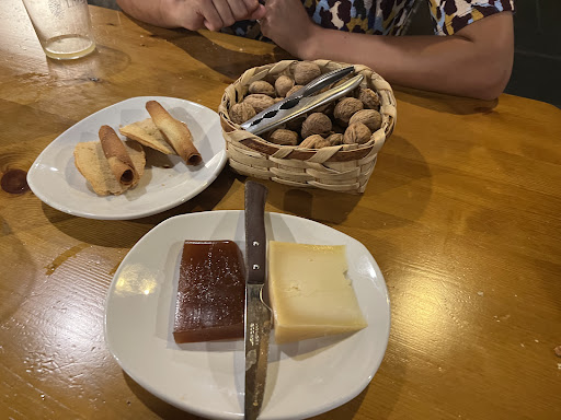 Read moreSan sebastian Town is amazing, we love it but if you want to be like a local then a Friday night at a cider house is the be top option and this place is one of the best. There's nothing fancy, just food and drink, we are veggie and our basque friend had advised them beforehand so I suggest if you are then say so . Our food was so simple but truly amazing, I've never had peppers and onions so tasty, the tortilla had lumps of local cheese instead of cod. For the meaties it's the standard fayre of cider houses. Cod tortilla, salchicon or fish pinxto then the most amazing looking steak, cheese and walnuts with membrillo to end with. To crack the walnuts you place one hand palm down over the nut and belt it with the othe hand in a fist, unless your a bit barmy then you use your head ! The cider is fantastic and a great laugh, it's released from a huge barrel and you catch it in your glass and bring it up to halfway up the flow, not too much, about a double shot size, drink most and throw a bit down the drain, as you can imagine it's not a place for posh clothes. Siderias are the basque country's best secret and as I say, this is one...