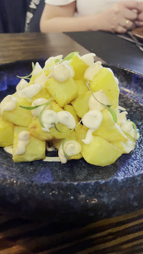 patatas bravas. Plato curioso porque viene servido con un poco de showcooking donde con un soplete prenden fuego a un gel con la idea de dar un toque ahumado y eso … show. Al experto en bravas "el niño" le encantaron. A mi me gustaron pero eché en falta mas salsa y más chispa en la salsa. No las volvería a pedir con la receta actual.