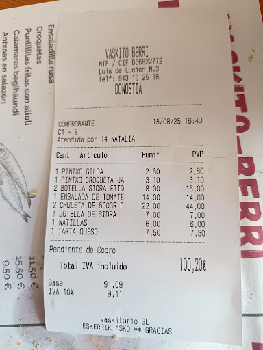 En cuanto a precios, me parecieron bastante elevados, especialmente teniendo en cuenta que el restaurante está a las afueras de Donostia: la botella de sidra, 8 €, me parece excesiva. Pedimos una chuleta que en carta figuraba como de medio kilo, pero no pesaba eso. Además, la carne estaba dura, muy hecha (para ser Euskadi, demasiado) y sin destacar en sabor.