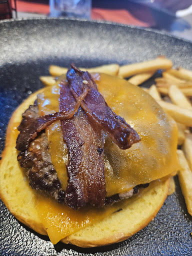 La comida es de una calidad extremadamente baja. Cuando comparas la foto de la hamburguesa en el menú con lo que te sirven en el plato, te sientes estafado. Este restaurante, de hecho, es un completo engaño. Mira, se supone que esta es la Smash Bacon and Cheese burger. Ni siquiera se molestaron en incluir una loncha completa de tocino, que probablemente costaría solo 10 céntimos más. En su lugar, la cortaron en unas pocas tiras delgadas. No hay salsa ni nada más, solo unas pocas patatas fritas secas y viejas, todo por el precio escandaloso de 14 euros. Puedes encontrar hamburguesas mucho mejores en cafés locales por la mitad del precio. No vayas aquí, porque...