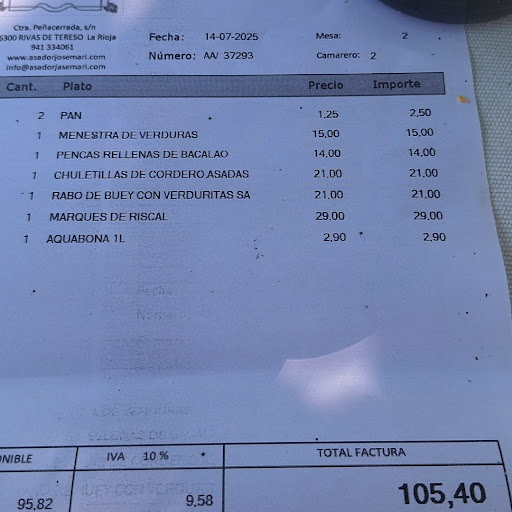 Lo que pagamos 💶 No voy a dorar la píldora: buena cocina, buenas raciones, precios justos. La botella de Marqués de Riscal Reserva 2017 a 29 € es de esas tentaciones que te hacen pensar en pedir una segunda… hasta que recuerdas que queda conducir. Entre entrantes, principales, la cuenta final quedó en torno a 37 € por persona, una cifra más que razonable para la calidad y el entorno. En general, carta honesta y, para estar en La Rioja, con esa relación calidad-precio que te empuja a probar “un poquito más”. Al precio anterior hay que añadir el vino y agua que tomamos.