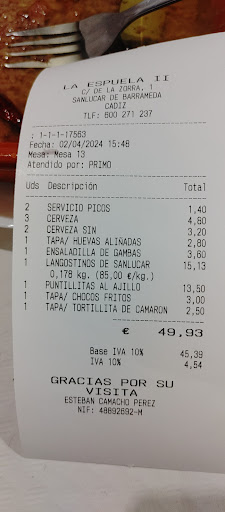 Si subo este comentario es por que te indignan comentarios asi como el que nos han dejado hoy Martes 7 de Julio ,Manu y Ana de Dios, mañana cumplimos 12 años abierto en BAR LA ESPUELA 2 y jamás hemos timado a nadie ni engañado a nadie, pero cuando te faltan al respeto de esta manera a mi , a mis trabajadores y a Bar La Espuela 2, pues tenemos que decir lo que pensamos.