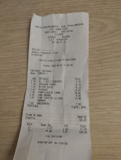 Read moreThere were 2 restaurants next to each other. Sa Palmera(SP) was open, the other was closed for siesta. Missed even looking at the menu. SP did a range of food, none of which were pizza or pasta. I would say they were aiming for local style (lol) until I found their meal of the day was schnitzel! (it's German). It was lovely tomato, red onion a small serving of chips, with a Spanish standard of olives, aioli and bread accompaniment. I could go on about the happy waitress, natural setting, birds tweeting and so on but I'll just say it's a very nice...