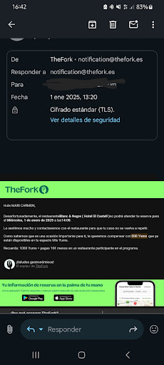 Read moreCuidado con las reservas! Reservé el día 29 dic 2024, mediante la app the fork para ir a comer el día 1 ene 2025, mi marido y yo con nuestro bebé. El día 30 dic 2024 me envían confirmación de la reserva (adjunto pantallazo) el día 31 dic 2024 me vuelven a preguntar sí todavía estoy interesada en la reserva, me meto en el link que me adjuntan para confirmar y confirmo. El día 1 ene 2025, a las 13:40h (adjunto pantallazo) nosotros ya montados, con la bebé en el coche, de camino al restaurante, me envían un mensaje diciendo que el restaurante me cancela la reserva. Llamamos y la única solución que me dan es que ellos no aseguran una reserva con the fork... peeerdona? Entonces para que te unes a la app para que reserven por allí? Hasta ahora con the fork no he tenido ningún problema y soy asidua a usarlo... El problema está en este restaurante que lejos de darme una solución, se ha limpiado las manos echando la culpa a la app para reservas y dejándonos colgados sin pedirnos ni disculpas... Total, nos he mos quedado el día 1 de enero sin reserva en ningún sitio, en mi aniversario, colgados como una marioneta y comiendo lo que nos han querido servir en un bar. Por mi y mi entorno, ya pueden cerrar el...