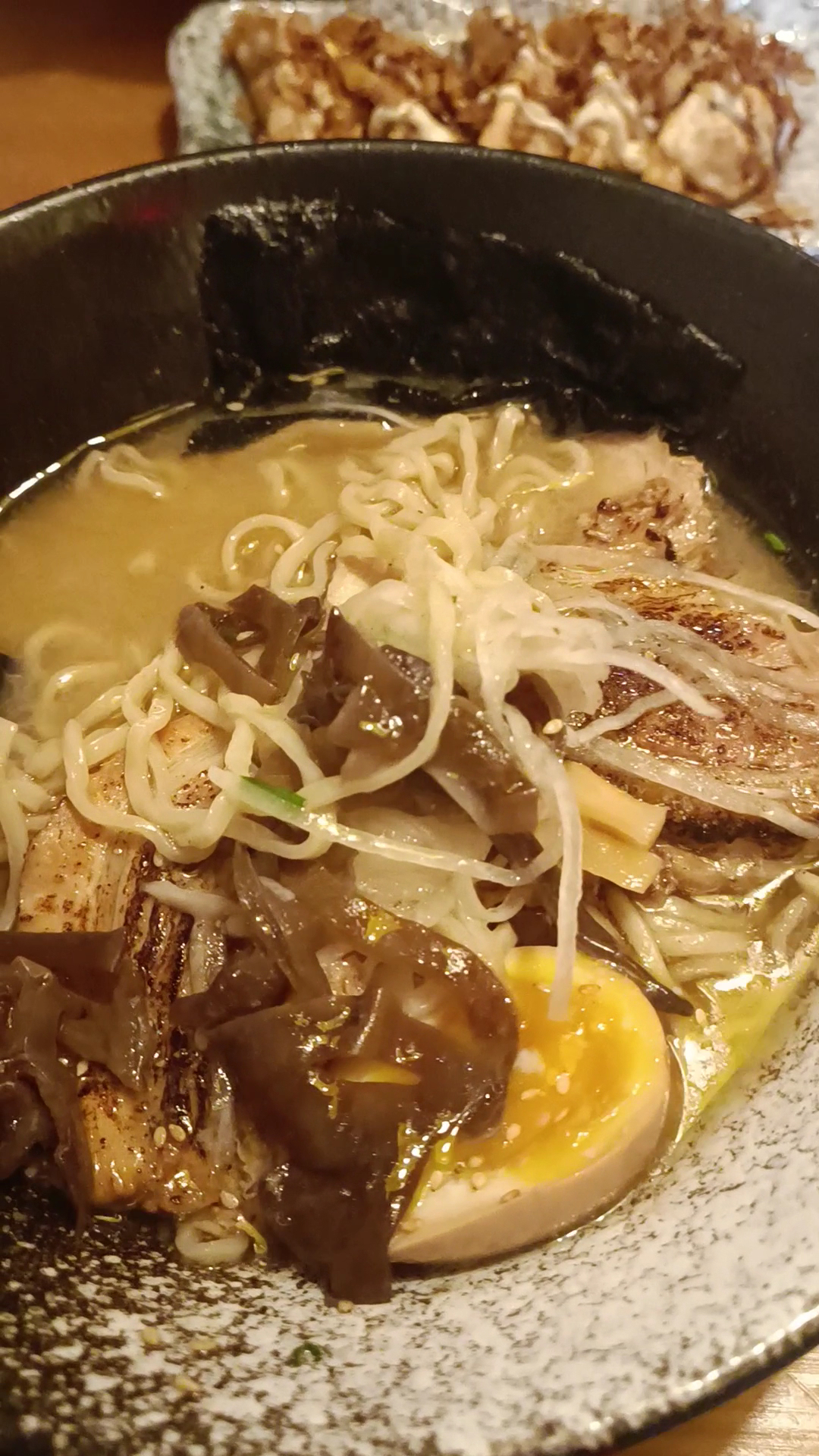 Hablando de la comida, el ramen aquí es simplemente excepcional. Probé el Tonkotsu Ramen, y puedo decir con certeza que es uno de los mejores que he probado en mi vida. El caldo es rico y cremoso, con un sabor profundo que se nota ha sido cocinado lentamente para extraer todo su sabor. Los fideos tienen la textura perfecta, ni demasiado blandos ni demasiado firmes, y absorben el sabor del caldo de manera espectacular. Las lonchas de cerdo chashu se deshacen en la boca, llenas de sabor y perfectamente cocinadas. Cada ingrediente, desde los huevos marinados hasta las algas y el maíz, está cuidadosamente seleccionado para complementar el plato.