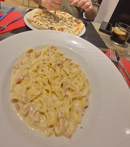 Fui porque había visto mucho este lugar en TikTok y ya por teléfono al hacer la reserva, el camarero me puso de los nervios (más tarde entendí porqué). Reconocible quien me había atendido, ya que al llegar me encontré con una persona que con su actitud evidentemente invitaba a la histeria, y entendiendo que se puede ser proactivo, ágil en tu trabajo, productivo, pero lo suyo pasaba al nivel de incomodar a todos los comensales de la mesa. En el transcurso de la comida tuvimos de todo, indigentes pidiendo mesa por mesa con un amago de pelea con el camarero (incomodando y enrareciendo el ambiente en sala), una señora africana vendiendo abalorios también mesa por mesa (ambos sin ser frenados por nadie del personal a la entrada) e incluso pasamos de pizzeria a restaurante griego porque los dos camareros empezaron a estrellar platos contra el suelo, con los consiguientes lamparones en nuestra ropa. La comida? Nada digno de repetir, por ejemplo un arroz duro como perdigones, unas patitas de calamar chiclosas como la goma, un pescado pasado y seco como suela de alpargata, aunque la ensalada se salvaba, pero hay que ser muy negado para hacer mal una ensalada. Los postres eran algo prefabricado así que tampoco me parece que tengan nada digno de reseña. Si tenemos en cuenta que hablamos de un menú de casi 25 euros, no creo que sea algo de lo que sentirse orgulloso. La deco en plan mafia calabresa muy bonita, aunque el mantenimiento brillaba por su ausencia en sala, con salpicones de líquidos en las paredes que parecían llevar más tiempo allí que alguno de los empleados. Un despropósito notable, con mucho margen de...