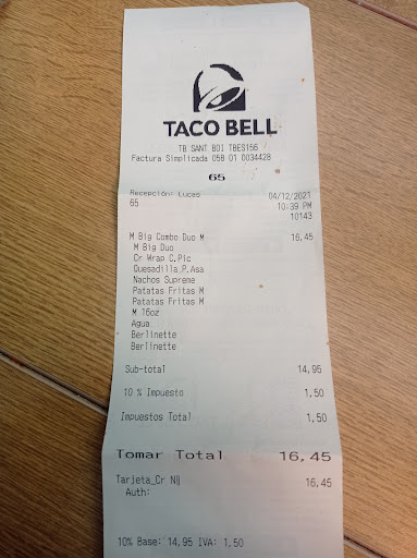 Read moreTaco Bell Sant Boi. La peor comida “mexicana”. Una estafa. Comida malísima no nos gustó NADA, nunca había salido de un sitio tan mal de comer como de aqui y con la barriga revuelta. Tacos poco relleno y malísimos. Los nachos que pedimos habia una miseria del guacamole (que es la razón por la que los pedimos) flipemos!! y iba todo lleno de la otra salsa y el queso ese que es de untar. Las tiremos todo el resto que quedó con la otra salsa a la basura de ahi mismo porque era incomible. Las patatas de bacon pues para casa, no te dan cubiertos ni palillos que te tienes que comer eso con la mano?? Se las comió en casa mi hermano y me dijo que habia un pelo largo. El colmo para rematar! El agua que se supone que te venden que pone en la pantalla es la Fuente Liviana y incluso se lo pregunté al chico antes del pedido para que me lo confirmara seguro y me dijo SI, la Liviana. Luego la que te dan es otra marca, Veri. Es muy grave lo que están haciendo para la marca promocionando la suya y es mentira. Espero queden informados y tomen cartas en el asunto. No soy de poner malas reseñas pero aqui va de la mala experiencia y mal comido, si eso se le llama comer con todo lo que hemos tirado y mal de estómago. 20€ tirados a la basura y para casa a hacerse algo! Pésima calidad y precios caros. Sin duda no pienso volver a ir. Ojalá hubiera visto las reseñas antes. Os recomiendo mucho mejor el Panchito le da cuarenta mil vueltas...