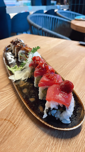 Spicy Tuna €13.90: ura-maki rolled in masago roe, avocado, tuna tartare, and a bit of spicy.
