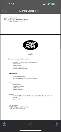 Si quieres probar un restaurante en Sant Cugat que tiene de todo, es este. De todo es desde tostadas, a arroces, pasta, platos combinados, carnes, bocadillos, crepes y un largo etcétera. Quizá por eso mi valoración es un 4, abarcar mucho es imposible. Quizá mejor concentrase en lo que pueden hacer bien. Nosotros fuimos para probar las crep (nombre del restaurante Crep Nova). Pedimos de primero, para compartir, un bikini Huevo Loco, muy correcto y bien hecho si bien el pan de molde es pequeño y justo, pero los ingredientes bien cocinados. Luego decidimos probar un crep, en este caso el Creppe Queso Jamón Serrano (tenéis foto de factura para ver precios). También muy bueno y correcto en calidad y cantidades que ofrece. Se nos ocurrió pedir un plato que siempre nos gusta probar y es el Steak Tartare. Mas que nada por saber que nivel y calidad podría tener. Le damos un 3 sobre 5. Pasable pero no de lo mejor pero correcto. Los postres: Creppe de azúcar y Creppe de chocolate Negro, los dos muy ricos. Tienen buena variedad de creppes de postre, por lo que se puede ir a media tarde a picar algo por ejemplo. El local muy grande y acogedor, disfruta del parking del mercado de Torreblanca pero suele estar bastante lleno. Bien para mesas grandes con amigos (después de pandemia) y sobre todo para disfrutar de una buena terraza exterior. Como digo situado en una buena zona con otras opciones para tomar copas después de la cena o antes o después de ver alguna obra en el Auditori. Bebida una jarra de sangría de lo mas normal, no sobresale, bien correcta. El servicio atento y correcto. Quizá faltaría alguna sonrisa de vez en cuando. Os aconsejamos probarlo y sobre todo agradecemos si os ha gustado un like o cualquier...