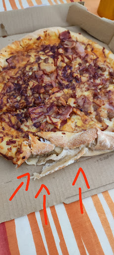 “pizza carne y bacon” 4 cachitos de carne repartidos en 3 triángulos y solos 6 pedazos de bacon.