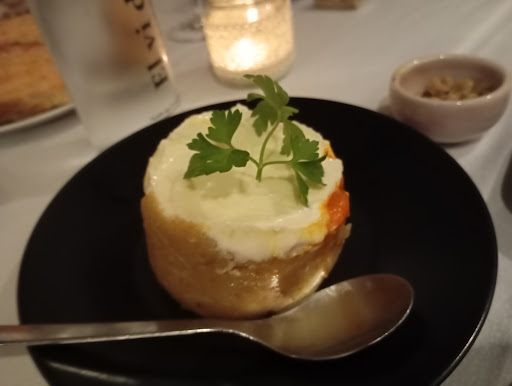 Queríamos probar un sitio nuevo, al ver las opiniones de trip nos decidimos por este local. Al llegar las mesas de la primera planta estaban llenas y nos prepararon una en la planto baja. Tuvimos la suerte de estar solos, era como estar en un reservado, con una decoración acogedora y agradable. Como aperitivo nos pusieron unos trozos de pan con unos aceites muy buenos. Parece algo simple, pero acabó resultando un aperitivo perfecto.