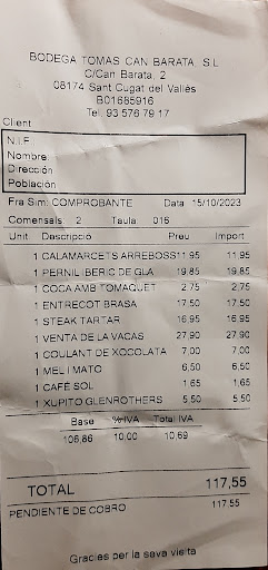 Read moreNada que ver con la Bodega Tomas de Sant Cugat. Estamos aostumbrados a ir a bodega Tomas de Sant Cugat y hoy hemos decidido ir a este porque nos queda más cerca y hemos pensado que se asemejaría a la calidad que ofrecen en Sant Cugat. Es del mismo dueño entendemos, pero nos ha parecido la versión pobre. Lo único en lo que se parece es en el nombre. El sitio es acogedor, es lo único positivo que puedo decir sobre este restaurante. Hemos pedido una ensalada de ventresca de atún con queso manchego (que carecía de cantidad, he tenido que buscarlo debajo de las piedras). Sin más. Un canelón de pollo con trufa y foie que venía en un plato de plástico hirviendo y el canelón medio frío. Hemos compartido un arroz con bogavante, que no tenía mal sabor pero tanto el bogavante como las gambas eran congeladas y sabían a champú. Soy una amante del marisco y eso era incomible. El jefe nos ha emplatado el arroz pero ha dejado todo el bogavante en la olla que ha dejado encima de la mesa para servirnos nosotros. Sospechoso. He empezado a comerme el bogavante y tenía un aspecto raro, por lo que he decidido girar la cabeza y me he encontrado con una cabeza negra-verde por dentro, qué horror. Eso estaba malo de hace unos días por lo menos. Se lo hemos dicho al camarero porque nos ha preguntado porqué nos habíamos dejado todo el bogavante, y la verdad que ha sido MUY amable y muy atento, creo que el que debería ser jefe es él, no el jefe de verdad, que cuando el camarero ha ido a comunicarselo ni se ha dignado a preguntarnos qué había pasado y ni siquiera interesarse por nuestro bienestar. Lamentable. El camarero nos ha dicho que el producto que ofrecían era el mismo proveedor que el de Sant Cugat pero es imposible, porque aquí no volveremos, en el de Sant Cugat volveremos siempre. De hecho dejamos una reseña hace un tiempo en el restaurante bodega Tomas San Cugat y...