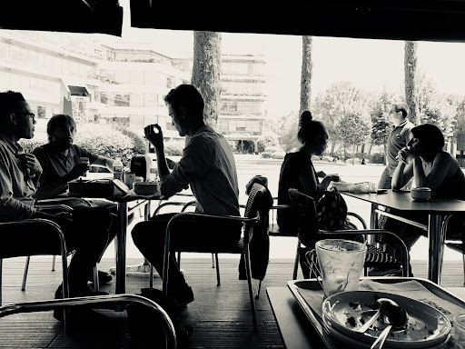 [julio 2018] El calor aprieta y la terraza empieza a estar más vacía, o tal vez sea que empiezan las vacaciones? 🤔 El carmín intenso sigue estando de moda, pero parece que la manga larga es cosa del pasado así que ahora las amigas lucen corta, pero no por ello se cortan en replicar nuestros audaces comentarios, "que si no queréis pastas con el café", "que si venga que se vais al gym a primera hora" ..todo puro marketing para vender más y cookies 🍪 y engancharnos a los dulces.. buen servicio, pero malas consejeras, no os creáis todo lo que os dicen bajo esas sonrisas.