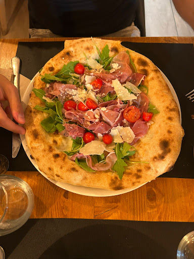 Una vez sentados, la comida muy buena, la materia prima de las pizzas se nota de calidad, muy sabroso y la masa muy fina. Pedimos tres entrantes y una pizza cada uno. Gorgonzola y Mortadella Tartufata muy buena. La Bandiera Italiana muy cara para lo que es, un poco decepcionante de sabor.