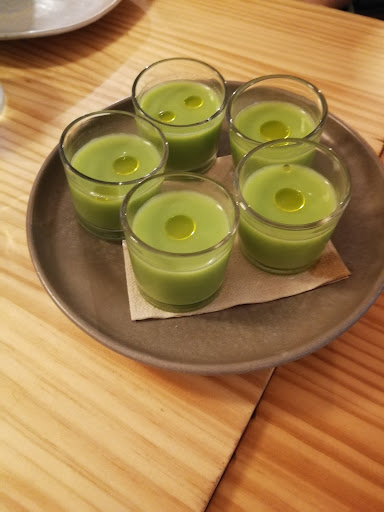 Read moreRaciones diferentes Increible este sitio que anteriormente fue una iglesia evangelica. Tiene un patio ideal para el verano, pero dentro las mesas son un poco pequeñas excepto la de la salida al patio que es ideal para 4-6 personas y poder hablar y reir tranquilamente. Cuando te cuentan que toda la comida la hacen con un microondas, termomix y horno no te lo puedes creer porque el resultado es impresionante. Hay que elegir dos raciones por comensal, donde no hay que perderse las gambas, las almejas, un nombre raro para un humos de berenjena, las anchoas/boquerones y acabar con la costilla de cerdo a baja temperatura. Tiene buenos vinos y buena cerveza, además de que ponen muy bien las copas con buena selección de ginebras que es su fuerte. Lo único criticable y bajo mi gusto es que ponen demasiada cebolla y en trozos demasiado grandes en los tartar, que mata un poco el sabor, por más que les pide que lo hagan pequeño o menos cantidad no hay manera, el cocinero a lo suyo; la próxima vez sin cebolla o no lo traen. La experiencia es magnífica, todo para compartir y opinar,...