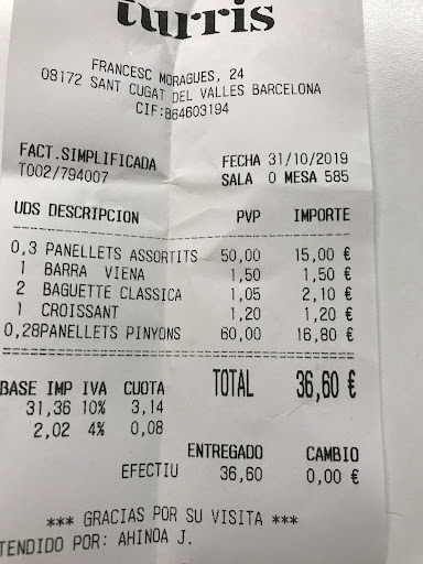 Read moreSoy cliente habitual de este establecimiento.Me gustan sus variedades de pan xuscos, moldes, chapatas,etc.Así como su surtido en bollería pero me han decepcionado enormemente sus "Panellets".Totalmente insaboros,secos y con un mazapán pésimo.No hacen honor al buen trabajo de esta cadena y me parece extraño que vendan un producto de tan mala calidad y a un precio carísimo a nivel de pasteleria. Otros años los había comprado y eran excelentes pero después de la mala experiencia tengo claro donde no acudiré a comprar Panellets para la...