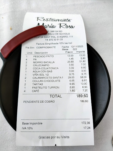 Read moreEn bref, réputation méritée, bon rapport qualité prix, penser à réserver. En détails, ce restaurant ouvert toute l'année est une institution depuis très longtemps. Il est situé sur une plage réputée (Sant Pol), autant dire qu'il est vivement conseillé de réserver sa table, même hors saison. Fréquenté par des habitués épicuriens, l'ambiance dans la salle est "typique". C'est à dire que dans la région quand on mange bien on est content, et quand on est content on parle un peu fort. Chez Maria Rosa on mange très bien. En terrasse les voix se font plus discrètes. Certes pour les tables en bord de route la circulation peut éventuellement représenter une gêne (moins hors saison), pour moi ça n'est pas rédhibitoire. La présentation des plats est soignée, tout comme la cuisine, elle aussi typique. Pour commencer partager un "para picar" comme le "Pescadito frito" (n° 3 sur la carte) peut être une bonne alternative aux entrées. En plat outre les riz et poissons on peut se régaler avec les petits calamars avec des haricots de Santa Pau (village situé entre le lac de Banyoles et le volcan Croscat). Les vins ne vous décevront pas, même le Vinal Sol blanc d'entrée de gamme est très facile à boire. Quant au prix, vu la situation (S'Agaro est un quartier de villas huppées) et la qualité des plats, il est sensiblement moins élevé qu'aux alentours immédiats. Le pain est facturé, c'est une pratique...
