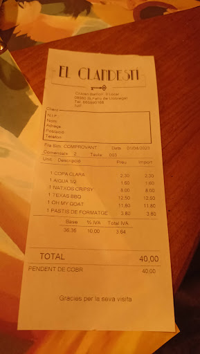 Read moreUn local petit, acollidor i encantador al centre de Sant Feliu, on sopar en família és com estar a casa teva. Un lloc ideal per a trobades familiars, amics o parelles. El local està decorat amb molt bon gust, des de les parets al sostre i acabant a la taula. Pel que fa a la carta, és molt variada i la relació menjar-preu, la vaig trobar molt correcte. No és una simple hamburgueseria, és un local on pots compartir una bona estona amb la teva gent i gaudir d'uns plats ben cuinats i presentats. La meva filla va voler provar l' hamburguesa de cigrons i era deliciosa! El Clandestí, a on no havia anat mai, ara amb un nou director que ha agafat la batuta per dirigir-lo de manera excel·lent. Com es nota el bagatge que té!!! Ha format un equip de persones joves, des del cuiner al cambrer, que amb alegria i somriure és preocupen que no et falti de res. Aquí l'experiència està en cada detall i es nota. Si sou de menjar bé, com jo, us recomano que us animeu, si no ho heu fet ja, i gaudiu d'una vetllada...